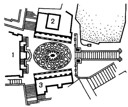 Рис. 3. Темпьетто во дворе церкви Сан-Пьетро ин Монторио. Рим. 1502 г. Общий вид. Разрез, план.