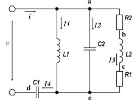 Дано: R1=10 Ом; R2=20 Ом; L1=31,8 мГн; L2=50,9 мГн; C1=318 мкФ; C2=199 мкФ. Определить: XL1, XL2, XC1, XC2, I, I1, I2, I3, I4, i. |