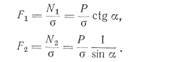 Пример 1.4. Кронштейн АВС нагружен на конце силой Р (рис. 24). Требуется подобрать поперечное сечение стержней А В и ВС с таким расчетом, чтобы возникающие в них напряжения имели одинаковую заданную величину а. При этом угол