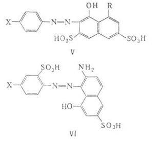 -электронной системы и усилением ее поляризации следующими способами: заменой электронодонорных заместителей на более сильные или введением дополнит. заместителей (например, как в моноазокрасителях общей формулы V); введением электроноакцепторных заместителей в остаток диазосоставляющей (VI); применением в качестве диазосоставляющей аминов гетероциклического ряда. Моноазокрасители общей формулы V могут иметь оранжево-красный (X = Н, R = Н), ярко-красный (X = Н, R = = NHCOCH3), синевато-красный (X = Н, R = NH2), красно-фиолетовый (X = CH3CONH, R = OH), фиолетовый (X = = NH2, R = OH) и голубой [X = (CH3)2N, R = ОН] цвета; моноазокрасители общей формулы VI - рубиновый (X = NH2) и фиолетовый (X = NO2).
