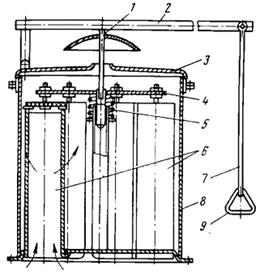 1 — толкатель; 2 — рычаг; 3 — крышка; 4 — траверса; 5 — пружина;