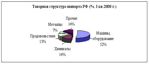 Оценивая структуру российского импорта в целом, следует отметить, что она выглядит прогрессивно: лидируют здесь машины, оборудование, химические продукты. Российские корпорации сегодня в значительных объемах импортируют европейское и американское оборудование для добычи минеральных ресурсов, строительную технику, грузовые и легковые автомобили, медицинское оборудование, компьютеры, комплектующие для их производства и офисное оборудование. Вместе с тем, высокий удельный вес продовольствия и сельскохозяйственного сырья в российском импорте создает определенные угрозы экономической безопасности страны.