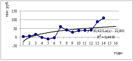 Также не возможно сказать о тенденции роста или спада прибыли от реализации, так как на протяжении 14 лет изменение ее значений происходило крайне не стабильно. Поэтому следует изобразить отдельно два фрагмента этого графика (рисунок 5, рисунок 6).