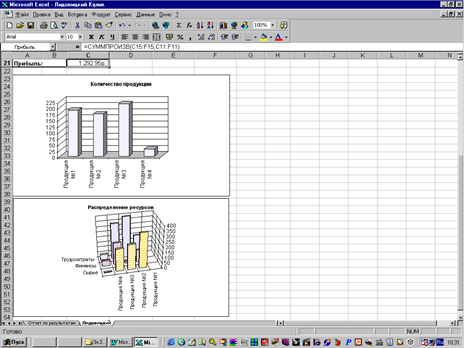 Оформляем результаты решения графически. Строим диаграммы "Количество продукции" и "Распределение ресурсов".