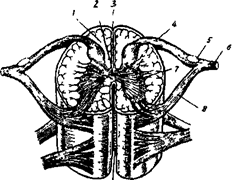 Рис. 15А. 1 - белое вещество мозга; 2 - спинномозговой канал; 3 - задняя продольная борозда; 4 - задний корешок спинномозгового нерва; 5 –спинно-мозговой узел; 6 - спинномозговой нерв; 7 -серое вещество мозга; 8 - передний корешок спинномозгового нерва; 9 - передняя продольная борозда