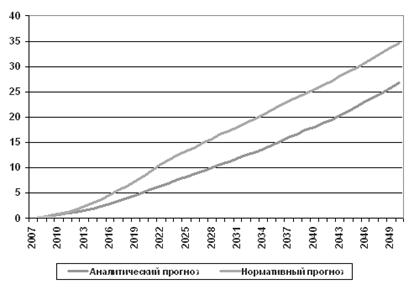На рис. 36 приведены оценки будущих объемов миграции по двум вариантам прогноза: "нормативному", т.е. ориентированному на достижение целей, обозначенных в официальной Концепции демографической политики (с сохранением этих ориентаций и после 2025 г., когда заканчивается срок действия Концепции), и более щадящему "аналитическому", который предусматривает замедление сокращения населения России, но не полное его прекращение.