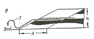 Рис. 6 - Схема производства добычных работ с применением рыхлителей: а - разработка уступа наклонными слоями; б - разработка уступа горизонтальными слоями с нормальным откосом уступа; в - то же, с выположенным откосом; 1 - экскаватор; 2 – бульдозер; 3 - погрузчик