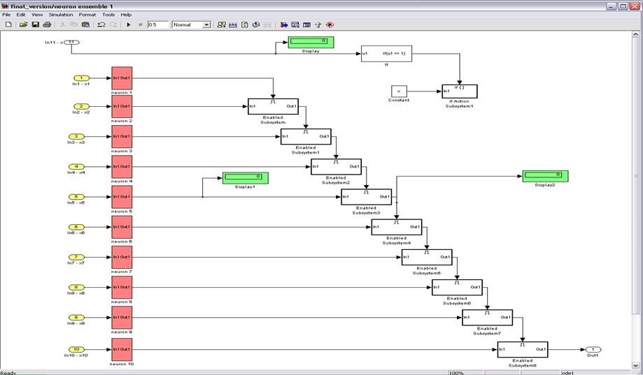 После обучения нейронного ансамбля, он будет узнавать только сигнал, мало отличающийся от запомненного. Т.е. ансамбль будет генерировать положительный импульс только в случае резонанса входного сигнала и сигнала, которому обучен ансамбль (рис. 16).