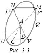 Прямые UV и MN на рисунке 3-3 расходятся. Можно сказать, что расходящиеся прямые изображаются такими хордами абсолюта, что содержащие их проективные прямые пересекаются в точке, внешней относительно абсолюта.
