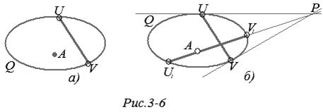 Замечание. Используя доказанную теорему, легко решить следующую задачу на модели Кэли — Клейна. На плоскости Λ2 даны прямая UV и точка А, не лежащая на ней (рис.3-6, а). Построить прямую, проходящую через точку А и перпендикулярную к прямой UV. На плоскости Р2 строим полюс Р проективной прямой UV и проводим проективную прямую АР, которая пересекает абсолют Q в точках U1, V1 (рис. 3-6, б). По доказанной теореме хорда U1, V1 является искомой прямой плоскости Λ2.