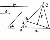Задача. Построить треугольник, если известны: длина основания а, угол при основании α и разность двух других сторон d.