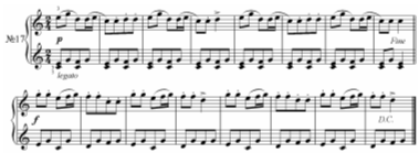 Каждый раз, когда мы приступаем к изучению нового этюда, полезно ознакомиться с текстом глазами. Очень облегчает исполнение, когда ученик видит в тексте повторяющиеся элементы мелодической фактуры. Пример №17:
