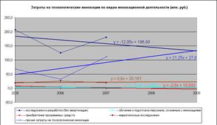 5. Используя возможности табличного процессора Microsoft Excel, на основании построенных ранее диаграмм спрогнозирую развитие инновационных затрат. Для этого по очереди выделяя линии рядов данных необходимо дать команду Добавить линию тренда в контекстном меню. На вкладке Тип выбираю Линейная, а на вкладке Параметры в блоке Прогноз устанавливаю значение 2 в поле вперед на и включаю флажок параметра Показывать уравнение на диаграмме (рис. 10).