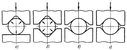 Если обрабатывать круглую заготовку плоскими бойками (рис. 1) при небольших обжатиях за каждый удар молота или нажим пресса, непрерывно кантуя ее после каждого удара, то можно получить заготовку меньшей площади также круглого сечения. Однако в практике ковки давно известно, что при таком способе протяжки круглой заготовки даже из пластичной стали, по ее оси образуются рыхлоты.