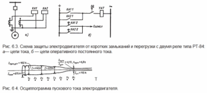 Как видно по осциллограмме, приведенной на рис. 6.4, на которой показан пусковой ток электродвигателя питательного насоса, в первый момент пуска появляется кратковременный пик намагничивающего тока, превышающий пусковой ток электродвигателя. Для отстройки от этого пика ток срабатывания отсечки выбирается с учетом коэффициента надежности: kн=1,8 для реле типа РТ-40, действующих через промежуточное реле; kн = 2 для реле типов ИТ-82, ИТ-84 (РТ-82, РТ-84), а также для реле прямого действия.
