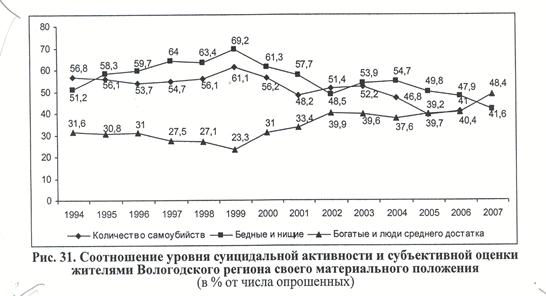 Субъективная оценка населением Вологодской области уровня своего материального положения свидетельствует о тесной связи количества самоубийств и доли людей, относящихся себя к «бедным» и «нищим» слоям населения. Особенно наглядно она проявлялась в период с 1996 по 2001 гг. Коэффициент корреляции между уровнем смертности от самоубийств в Вологодской области за период с 1999-2006 гг. и долей, относящих себя к бедным и нищим слоям населения, составил 0,84.