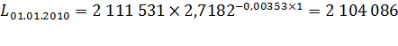 Согласно имеющимся данным, численность населения Оренбургской области на 1 января 2008 года составила 2 119 003 чел., на 1 января 2009 – 2 111 531 чел., за 2008 год родилось 26 947 чел., умерло 30 904 чел., 25 570 чел. прибыло и 29 085 чел. выбыло. Рассчитаем численность населения в 2010-2012 гг. при условии, что коэффициент общего прироста населения (
