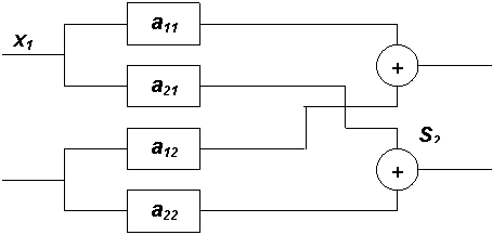 Структура данного объекта определяется двумя сумматорами S1 и S2, четырьмя линейно– усилительными блоками а11 , а12 , а21 , а22 и системой связей между ними.