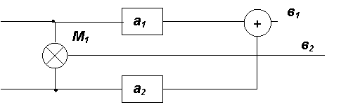 Такой объект представляет собой систему, которая имеет два входа х1 и х2 с постоянными значениями в установившемся режиме и два выхода в1 и в2. Структура объекта определяется сумматором S1 , умножителем М1, двумя линейно– усилительными блоками а1 , а2 и системой связей между ними.