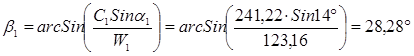 По треугольнику скоростей определили относительную скорость сопловой решетки W1=123,5м/с и угол входа потока в рабочую решетку β=28°С.