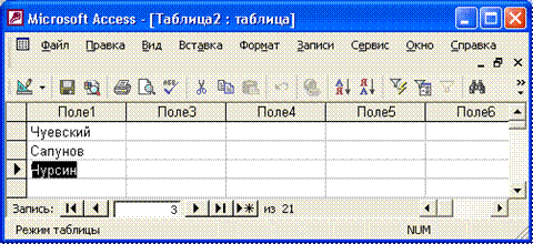 В поля этой таблицы нужно ввести требуемые данные. Тип данных в одном поле (столбце) во всех записях должен быть одинаковым.