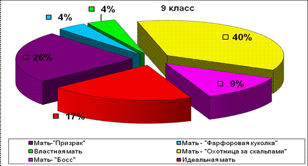 - в 9-ых классах опять же преобладают матери – «охотницы за скальпами», но и здесь же можно увидеть увеличение количества матерей – «призраков». Девятый класс, 14-15 лет, переходный возраст. Родители в этом возрасте начинают отпускать ребенка гулять допоздна, при этом, не проверяя, где он и с кем, оставлять его на несколько дней, а может и недель одного дома, не понимая какой вред они могут ему нанести. В этом возрасте дети начинают ощущать себя абсолютно взрослыми. Они начинают пить, курить, употреблять наркотики и вести беспорядочную половую жизнь. В этом и заключается роковая ошибка родителей. Они могут легко искалечить жизнь подростка, лишением присмотра и контроля над своим ребенком.