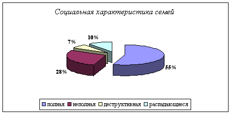2. 55% или 33 семьи носят статус полной семьи, т.е. в семьей имеется оба родителя; отмечается негативный микрофактор социального статуса семьи – неполная семья (8%-5 семей), деструктивная (1%-1 семья), распадающаяся (10%-6 семей). (см. график 2)