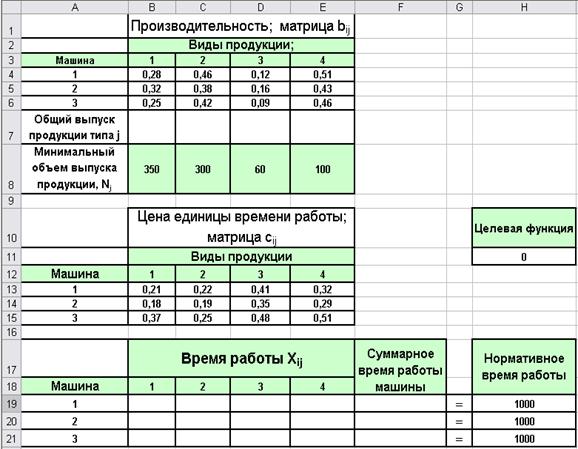 Проведем решение задачи в Excel. Введем данные на рабочий лист так, как показано на Рис 2.3.