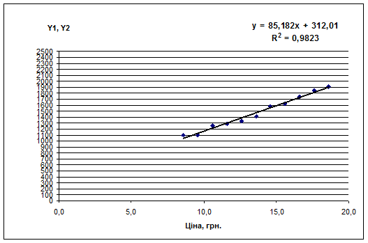 Строим точечную диаграмму по выходным данным Y( ). С помощью функции «Добавит линию тренда» строим линейный тип линии тренда (рис. 3.1). При этом включаем опцию вывода уравнения линии тренда и коэффициента детерминации R2.