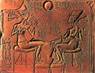 Наряду с плоским, почти не вы ступающим над поверхностью стены рельефом возник, а позже широко распространился так называемый углублённый рельеф: врезанное изображение заполнялось краской, и появлялся цветной силуэт. Рельефы развёртывались один над другим; каждый представлял собой повествовательный ряд. Фигуры располагались вереницами — в схожих позах, с одинаковыми жестами; на светлом фоне чётко выделялись кирпично-красные тела мужчин и жёлтые — женщин. Изображались сельские работы, труд ремесленников, охота, рыбная лов ля, процессии носителей даров, погребальные шествия, загробныепиршества, строительство лодок,игры детей и многие другие сцены. |